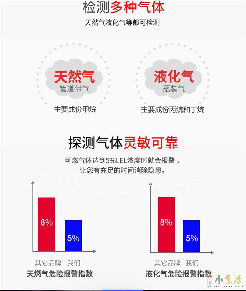 3大声报警,使用了钕铁强磁力喇叭声音能发出85分贝高音报警,使用更久更省电,探测气体灵敏可靠,可燃气体达到5%lLEL的浓度就会发出报警声音,让你哟充足的时间消除隐患xbaixing.com
