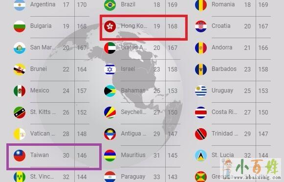 在最新排名中,台灣以146個免簽國,排在全球第30名;而香港以168個免簽國進到前20名,排在第19来自www.xbaixing.com。至於中國則與肯亞同列第74名,免簽國僅有70國x~b~a~i~x~i~n~g~c~o~m。阿拉伯聯合大公國的護照首次擠進前20名,免簽國家有165個,創下14年來新紀錄;而墊底的阿富汗免簽國家僅25國x.b.a.i.x.i.n.g.c.o.m。