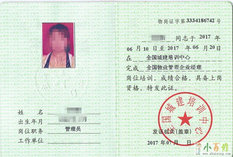由住建部颁发全国通用的全国物业管理企业经理岗位证书欢迎www.xbaixing.com。全国物业管理从业人员岗位证书是住建部物业管理申请资质、从业的**认证证书,持证上岗,国家承认www.xbaixing.com。