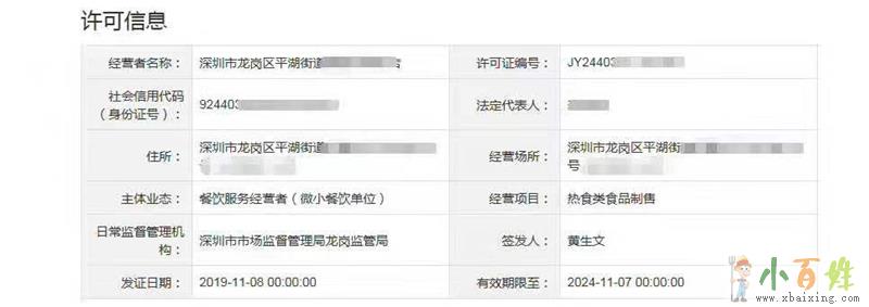 经营者名称、社会信用代码、法定代表人(负责人)、住所、经营场所、主体业态、经营项目、许可证编号、日常监督管理机构、日常监督管理人员、投诉举报电话、发证机关、签发人、发证日期、有效期x_b_a_i_x_i_n_g_c_o_m。