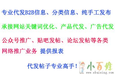 哪里有人工手工代发信息b2b信息代发,我们拥有专业的代发团队,为客户提供高效率的B2B平台信息代发、分类网站信息代发、代发产品、网站关键词优化推广、代发广告、公众号推广、贴吧、论坛代发,纯人工代发,提供报表,专业!效率!认真!欢迎咨询QQ:3613973584小_百_姓_网