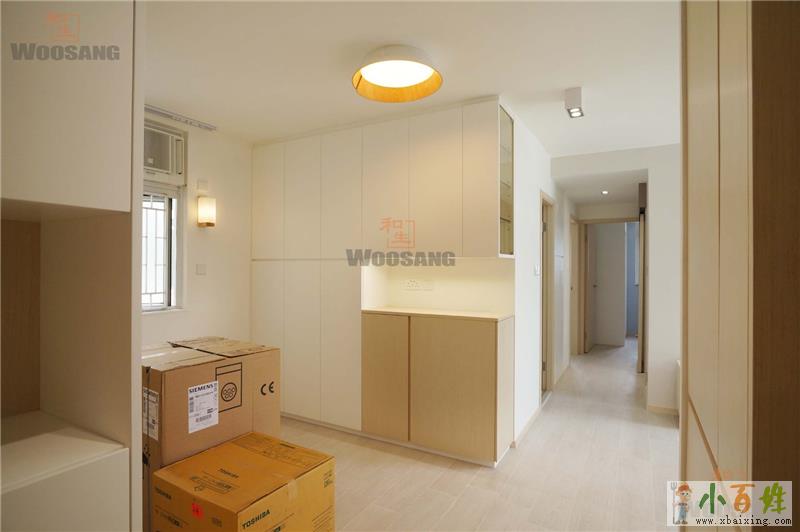 梳化位置因原本不夠放入三人座,故加上一小幅石膏板作間牆之用,然後以一組木飾面高櫃作修飾間牆,從而令飯廳能有效集中儲物而不失空間感www.xbaixing.com小百姓网。 而大門旁則特意做了一組工人床櫃及地櫃作儲物收納,工人床櫃的趟櫃門面亦花了不少心思,下門利用特別的圖案紋理作修飾,而上門以格仔作配襯,某幾格的通孔則作通風之用,藉著不同的慘光效果,減低壓迫感,令此組龐然大櫃的存在不會令空間變得壓迫侷促,而是添增幾分美感,外觀洋氣,節省空間,甚至可以成為焦點所在。而全屋房門,甚至連廚房趟門都做了格仔效果,作呼應之用x~b~a~i~x~i~n~g~c~o~m。